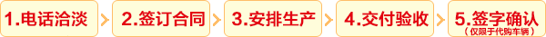 我們將謁誠(chéng)為您提供更好、更快、更優(yōu)質(zhì)的服務(wù)! ·第一步:購(gòu)車洽談: 通過(guò)電話或QQ聯(lián)系或?qū)嵉乜疾烨⒄勡囕v型號(hào)、價(jià)格和相關(guān)要求。 ·第二步:簽訂合同: 雙方簽訂車輛購(gòu)銷合同并預(yù)付合同定金(傳真簽訂合同、實(shí)地簽訂合同均可)。 ·第三步:安排生產(chǎn): 我公司根據(jù)合同要求,安排車間生產(chǎn)。 ·第四步:交付車輛: 車輛交付驗(yàn)收,支付車輛余款,完成相關(guān)手續(xù)。 交付方式:客戶可自提車輛,也可協(xié)商由我公司安排送車并協(xié)定相關(guān)費(fèi)用.更多詳細(xì)訂車流程請(qǐng)來(lái)電咨詢! |